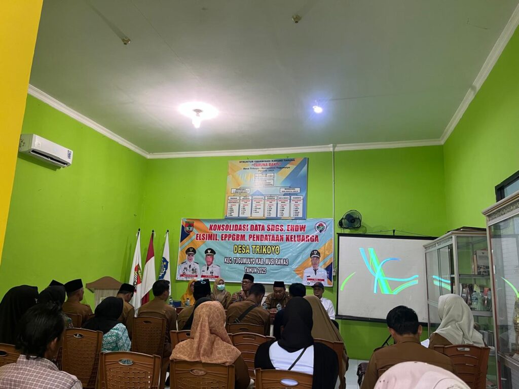 Pada bulan Agustus 2025, Pemerintah Desa Trikoyo, Kecamatan Tugumulyo, Kabupaten Musi Rawas, melaksanakan kegiatan Konsolidasi Data yang mencakup Sustainable Development Goals (SDGs) Desa, Elektronik Human Development Worker (EHDW) Elsimil, Elektronik Pencatatan dan Pelaporan Gizi Berbasis Masyarakat (EPPGBM), serta Pendataan Keluarga. Kegiatan ini menjadi salah satu agenda penting desa dalam rangka memperkuat basis data terpadu yang akurat, mutakhir, dan menyeluruh guna mendukung perencanaan pembangunan desa yang tepat sasaran. Konsolidasi data ini diikuti oleh perangkat desa, kader posyandu, kader kesehatan, kader pembangunan manusia (KPM), serta tim pendata keluarga. Tujuannya adalah menyatukan berbagai jenis data yang selama ini dikumpulkan secara terpisah, sehingga dapat digunakan sebagai dasar dalam pengambilan keputusan pembangunan desa, khususnya di bidang kesehatan, gizi, dan kesejahteraan keluarga.